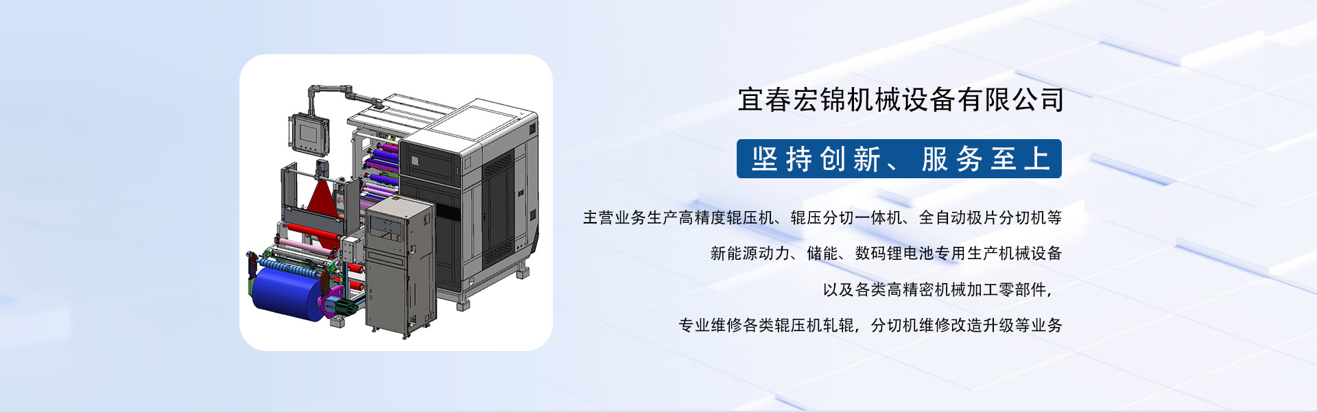 東莞市宏錦機(jī)械科技有限公司江西分公司是一家集研發(fā)、生產(chǎn)、銷售、服務(wù)于一體的創(chuàng)新型鋰電自動化精密機(jī)械設(shè)備專業(yè)制造、服務(wù)商,坐落于江西省新余市渝水區(qū)新余經(jīng)濟(jì)開發(fā)區(qū)孵化園5號廠房,廠房面積近6000平米,由東莞市宏錦機(jī)械科技有限公司于2024年11月投資新建,交通區(qū)位優(yōu)勢明顯、產(chǎn)業(yè)配套便捷集中,擁有一批具有行業(yè)豐富經(jīng)驗的技術(shù)人員和管理團(tuán)隊。公司主營業(yè)務(wù)生產(chǎn)高精度輥壓機(jī)、輥壓分切一體機(jī)、全自動極片分切機(jī)等新能源動力、儲能、數(shù)碼鋰電池專用生產(chǎn)機(jī)械設(shè)備以及各類高精密機(jī)械加工零部件,專業(yè)維修各類輥壓機(jī)軋輥,分切機(jī)維修改造升級等業(yè)務(wù)。根據(jù)公司發(fā)展三步走戰(zhàn)略規(guī)劃經(jīng)營現(xiàn)下設(shè)三個二級獨立運(yùn)營事業(yè)部分別為分切事業(yè)部(分切機(jī)、輥壓分切一體機(jī))、磨輥事業(yè)部(輥壓機(jī)、軋輥修磨)、機(jī)加事業(yè)部(精密機(jī)械部件加工)。經(jīng)過十余年沉淀發(fā)展主要客戶有新余贛鋒、南昌維科、宜春清陶、云南路華、河南恒一、江西程疆、四川天萊、蕪湖天弋、惠州億緯鋰能、無錫盤古新能源、鄭州比克、安徽鋰天下、臺灣長利(宏基集團(tuán))、重慶維都利(紫建電子)、贛州諾威、安徽利維能、漳州萬寶、重慶佳寶成、廣西皇冠儲能等一批具有行業(yè)知名度和影響力的企業(yè)。公司在新能源發(fā)展的道路上堅持創(chuàng)新,為客戶帶來穩(wěn)定、高效的自動化專用設(shè)備和更大的收益。